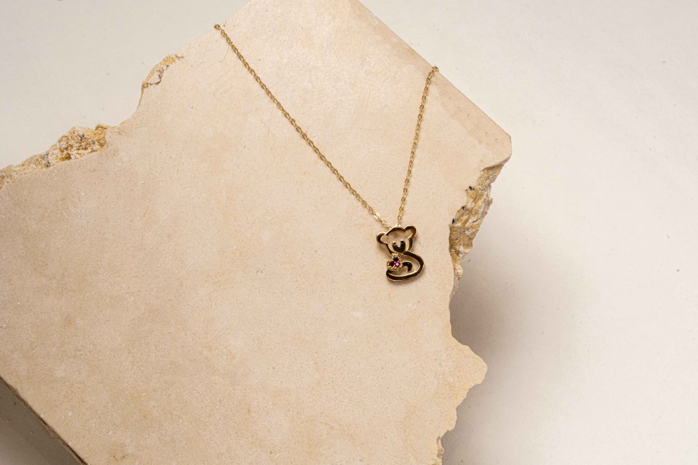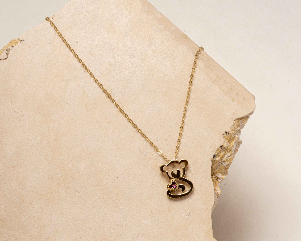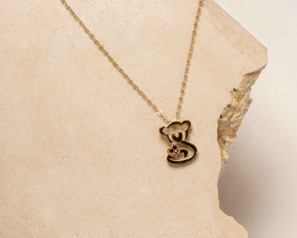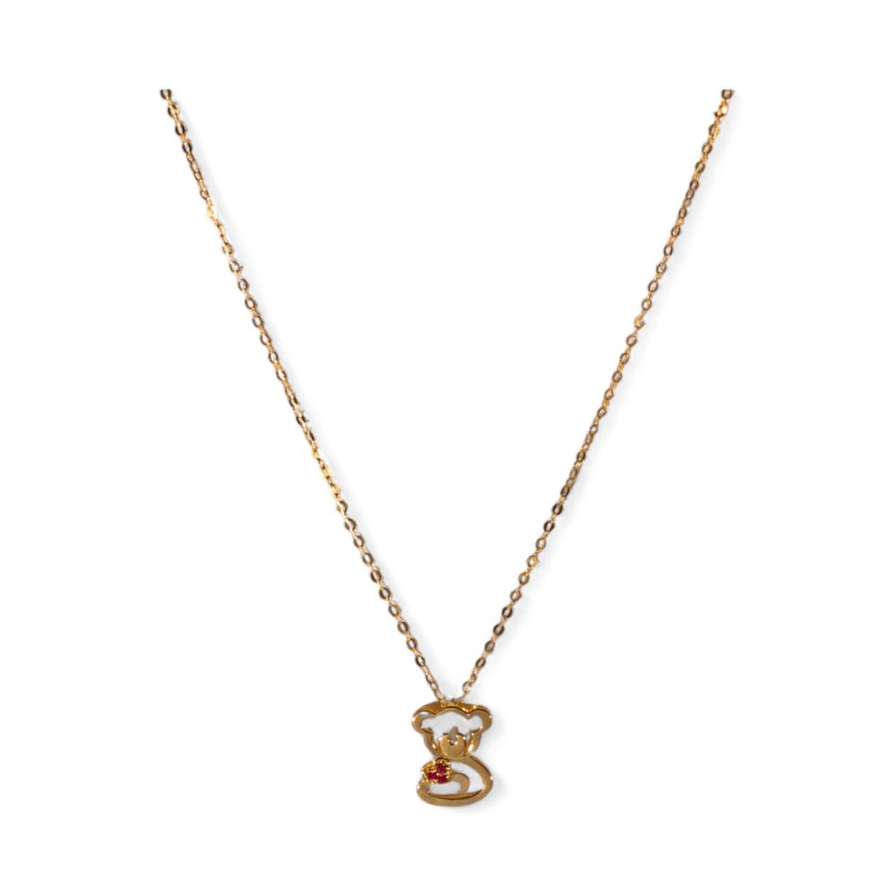 شوكر ناعم من الذهب عيار ١٨، يتميز بدلاية على شكل دب صغير مع قلب، مرصع بحجر الروبي الأحمر. التصميم الرقيق والجذاب يجعله مثالياً للإطلالات اليومية الناعمة والهدايا المميزة.